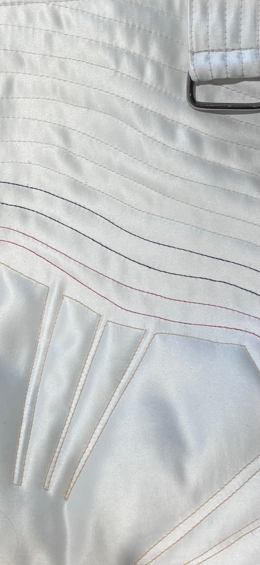 The threads used in this bag are in nod of the Philippine flag. The red thread is under the blue thread to signify peace, which is also a tradition borrowed from the Philippine flag.